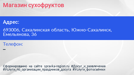 Магазин сухофруктов по адресу 693006, Сахалинская область, Южно-Сахалинск, Емельянова, 36 в дальнейшем Организация, размещена в следующих категориях: