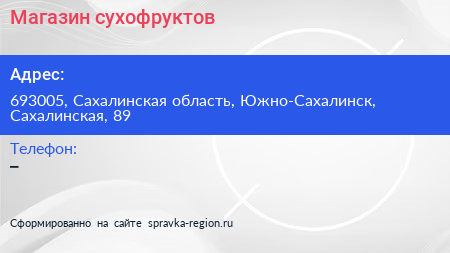 Магазин сухофруктов по адресу 693005, Сахалинская область, Южно-Сахалинск, Сахалинская, 89 в дальнейшем Организация, размещена в следующих категориях: