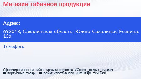 Магазин табачной продукции по адресу 693013, Сахалинская область, Южно-Сахалинск, Есенина, 15а в дальнейшем Организация, размещена в следующих категориях: