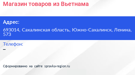 Магазин товаров из Вьетнама по адресу 693014, Сахалинская область, Южно-Сахалинск, Ленина, 573 в дальнейшем Организация, размещена в следующих категориях: