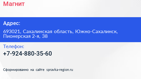 Магнит по адресу 693021, Сахалинская область, Южно-Сахалинск, Пионерская 2-я, 38 в дальнейшем Организация, размещена в следующих категориях: