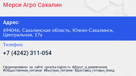 Мерси Агро Сахалин по адресу 694046, Сахалинская область, Южно-Сахалинск, Центральная, 17а в дальнейшем Организация, размещена в следующих категориях: