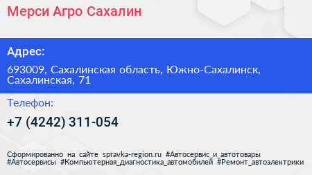 Мерси Агро Сахалин по адресу 693009, Сахалинская область, Южно-Сахалинск, Сахалинская, 71 в дальнейшем Организация, размещена в следующих категориях: