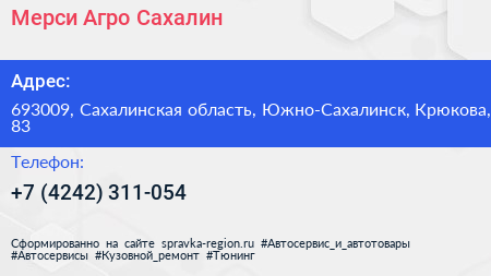 Мерси Агро Сахалин по адресу 693009, Сахалинская область, Южно-Сахалинск, Крюкова, 83 в дальнейшем Организация, размещена в следующих категориях: