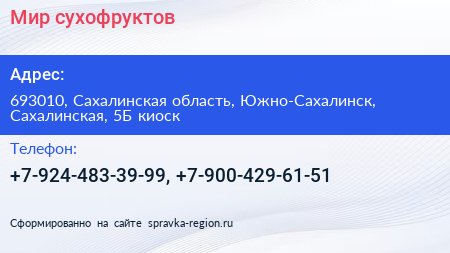 Мир сухофруктов по адресу 693010, Сахалинская область, Южно-Сахалинск, Сахалинская, 5Б киоск в дальнейшем Организация, размещена в следующих категориях: