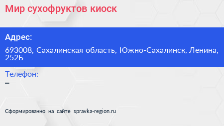 Мир сухофруктов, киоск по адресу 693008, Сахалинская область, Южно-Сахалинск, Ленина, 252Б в дальнейшем Организация, размещена в следующих категориях: