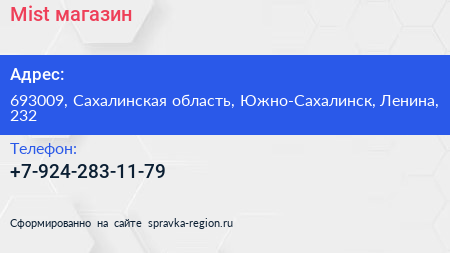 Mist, магазин по адресу 693009, Сахалинская область, Южно-Сахалинск, Ленина, 232 в дальнейшем Организация, размещена в следующих категориях: