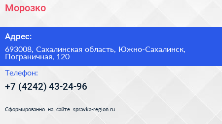 Морозко по адресу 693008, Сахалинская область, Южно-Сахалинск, Пограничная, 120 в дальнейшем Организация, размещена в следующих категориях: