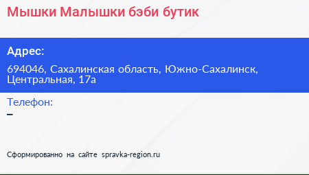 Мышки Малышки, бэби-бутик по адресу 694046, Сахалинская область, Южно-Сахалинск, Центральная, 17а в дальнейшем Организация, размещена в следующих категориях: