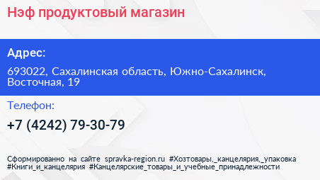 Нэф, продуктовый магазин по адресу 693022, Сахалинская область, Южно-Сахалинск, Восточная, 19 в дальнейшем Организация, размещена в следующих категориях:
