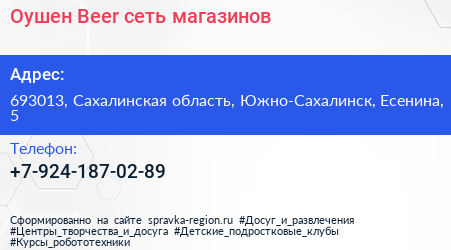 Оушен Beer, сеть магазинов по адресу 693013, Сахалинская область, Южно-Сахалинск, Есенина, 5 в дальнейшем Организация, размещена в следующих категориях: