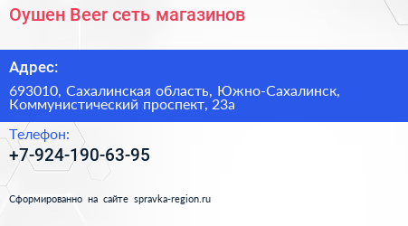 Оушен Beer, сеть магазинов по адресу 693010, Сахалинская область, Южно-Сахалинск, Коммунистический проспект, 23а в дальнейшем Организация, размещена в следующих категориях: