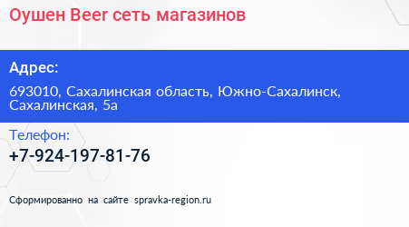 Оушен Beer, сеть магазинов по адресу 693010, Сахалинская область, Южно-Сахалинск, Сахалинская, 5а в дальнейшем Организация, размещена в следующих категориях: