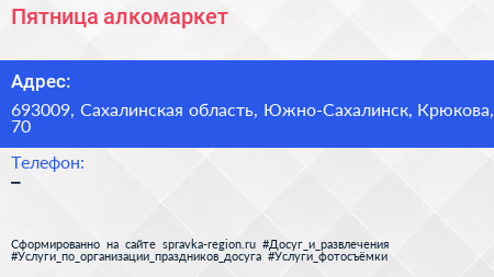 Пятница, алкомаркет по адресу 693009, Сахалинская область, Южно-Сахалинск, Крюкова, 70 в дальнейшем Организация, размещена в следующих категориях: