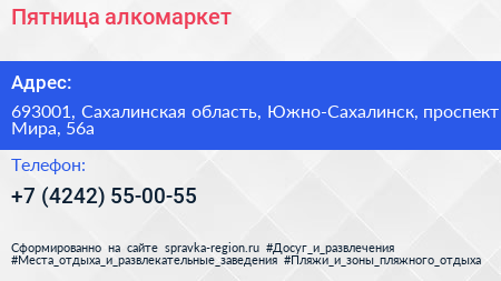 Пятница, алкомаркет по адресу 693001, Сахалинская область, Южно-Сахалинск, проспект Мира, 56а в дальнейшем Организация, размещена в следующих категориях: