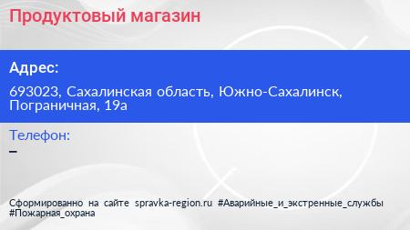 Продуктовый магазин по адресу 693023, Сахалинская область, Южно-Сахалинск, Пограничная, 19а в дальнейшем Организация, размещена в следующих категориях: