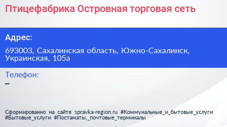 Птицефабрика Островная, торговая сеть по адресу 693003, Сахалинская область, Южно-Сахалинск, Украинская, 105а в дальнейшем Организация, размещена в следующих категориях: