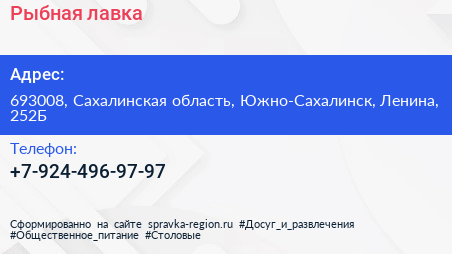 Рыбная лавка по адресу 693008, Сахалинская область, Южно-Сахалинск, Ленина, 252Б в дальнейшем Организация, размещена в следующих категориях: