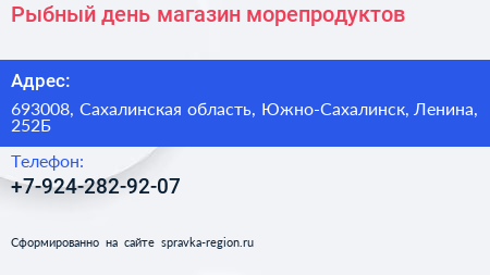 Рыбный день, магазин морепродуктов по адресу 693008, Сахалинская область, Южно-Сахалинск, Ленина, 252Б в дальнейшем Организация, размещена в следующих категориях: