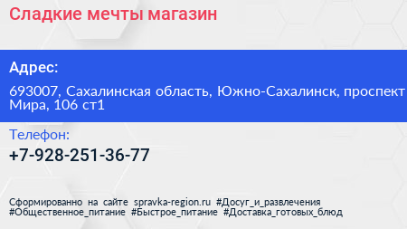 Сладкие мечты, магазин по адресу 693007, Сахалинская область, Южно-Сахалинск, проспект Мира, 106 ст1 в дальнейшем Организация, размещена в следующих категориях: