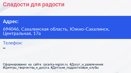 Сладости для радости по адресу 694046, Сахалинская область, Южно-Сахалинск, Центральная, 17а в дальнейшем Организация, размещена в следующих категориях: