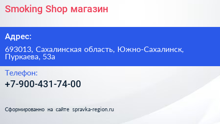 Smoking Shop, магазин по адресу 693013, Сахалинская область, Южно-Сахалинск, Пуркаева, 53а в дальнейшем Организация, размещена в следующих категориях: