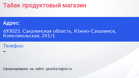 Табак, продуктовый магазин по адресу 693023, Сахалинская область, Южно-Сахалинск, Комсомольская, 241/1 в дальнейшем Организация, размещена в следующих категориях: