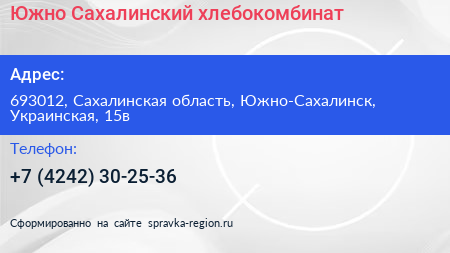 Южно-Сахалинский хлебокомбинат по адресу 693012, Сахалинская область, Южно-Сахалинск, Украинская, 15в в дальнейшем Организация, размещена в следующих категориях: