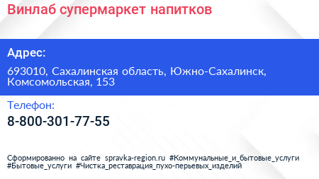 Винлаб, супермаркет напитков по адресу 693010, Сахалинская область, Южно-Сахалинск, Комсомольская, 153 в дальнейшем Организация, размещена в следующих категориях: