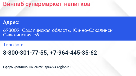 Винлаб, супермаркет напитков по адресу 693009, Сахалинская область, Южно-Сахалинск, Сахалинская, 59 в дальнейшем Организация, размещена в следующих категориях: