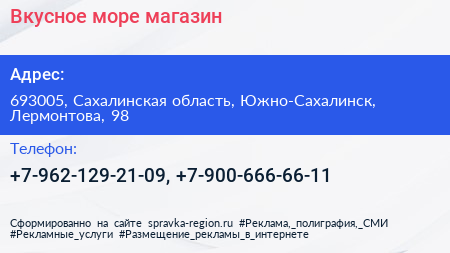 Вкусное море, магазин по адресу 693005, Сахалинская область, Южно-Сахалинск, Лермонтова, 98 в дальнейшем Организация, размещена в следующих категориях: