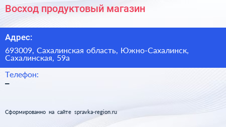 Восход, продуктовый магазин по адресу 693009, Сахалинская область, Южно-Сахалинск, Сахалинская, 59а в дальнейшем Организация, размещена в следующих категориях: