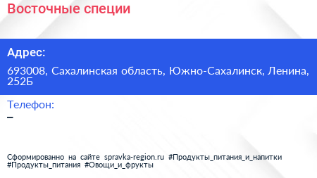 Восточные специи по адресу 693008, Сахалинская область, Южно-Сахалинск, Ленина, 252Б в дальнейшем Организация, размещена в следующих категориях: