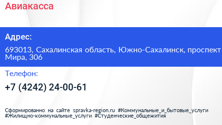 Авиакасса по адресу 693013, Сахалинская область, Южно-Сахалинск, проспект Мира, 306 в дальнейшем Организация, размещена в следующих категориях: