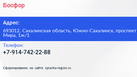 Босфор по адресу 693012, Сахалинская область, Южно-Сахалинск, проспект Мира, 1ж/1 в дальнейшем Организация, размещена в следующих категориях: