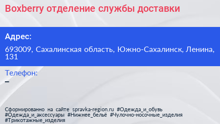 Boxberry, отделение службы доставки по адресу 693009, Сахалинская область, Южно-Сахалинск, Ленина, 131 в дальнейшем Организация, размещена в следующих категориях:
