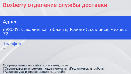 Boxberry, отделение службы доставки по адресу 693009, Сахалинская область, Южно-Сахалинск, Чехова, 72 в дальнейшем Организация, размещена в следующих категориях: