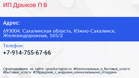ИП Дрыков П.В. по адресу 693004, Сахалинская область, Южно-Сахалинск, Железнодорожная, 165/2 в дальнейшем Организация, размещена в следующих категориях: