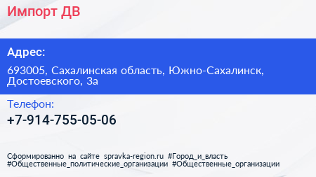 Импорт ДВ по адресу 693005, Сахалинская область, Южно-Сахалинск, Достоевского, 3а в дальнейшем Организация, размещена в следующих категориях: