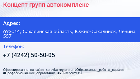 Концепт групп, автокомплекс по адресу 693014, Сахалинская область, Южно-Сахалинск, Ленина, 557 в дальнейшем Организация, размещена в следующих категориях: