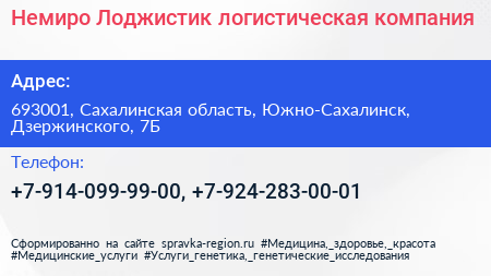 Немиро Лоджистик, логистическая компания по адресу 693001, Сахалинская область, Южно-Сахалинск, Дзержинского, 7Б в дальнейшем Организация, размещена в следующих категориях: