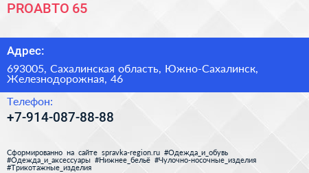 PROАВТО 65 по адресу 693005, Сахалинская область, Южно-Сахалинск, Железнодорожная, 46 в дальнейшем Организация, размещена в следующих категориях: