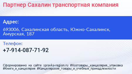 Партнер Сахалин, транспортная компания по адресу 693006, Сахалинская область, Южно-Сахалинск, Амурская, 187 в дальнейшем Организация, размещена в следующих категориях: