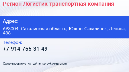 Регион Логистик, транспортная компания по адресу 693004, Сахалинская область, Южно-Сахалинск, Ленина, 488 в дальнейшем Организация, размещена в следующих категориях: