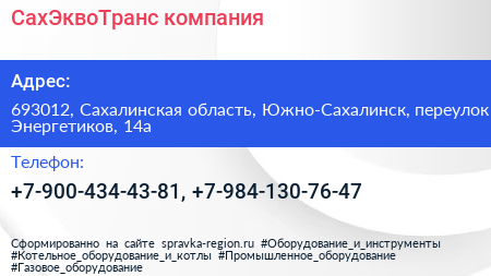 СахЭквоТранс, компания по адресу 693012, Сахалинская область, Южно-Сахалинск, переулок Энергетиков, 14а в дальнейшем Организация, размещена в следующих категориях: