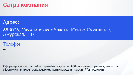 Сатра, компания по адресу 693006, Сахалинская область, Южно-Сахалинск, Амурская, 187 в дальнейшем Организация, размещена в следующих категориях: