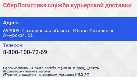 СберЛогистика, служба курьерской доставки по адресу 693009, Сахалинская область, Южно-Сахалинск, Амурская, 61 в дальнейшем Организация, размещена в следующих категориях: