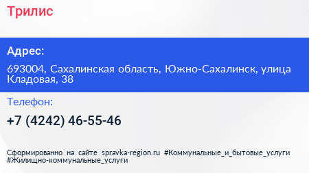 Трилис по адресу 693004, Сахалинская область, Южно-Сахалинск, улица Кладовая, 38 в дальнейшем Организация, размещена в следующих категориях: