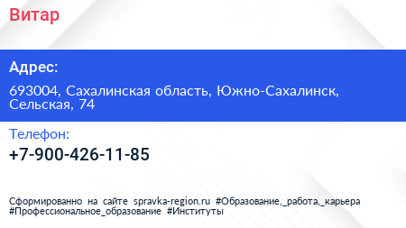 Витар по адресу 693004, Сахалинская область, Южно-Сахалинск, Сельская, 74 в дальнейшем Организация, размещена в следующих категориях: