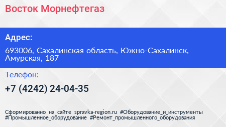 Восток Морнефтегаз по адресу 693006, Сахалинская область, Южно-Сахалинск, Амурская, 187 в дальнейшем Организация, размещена в следующих категориях: